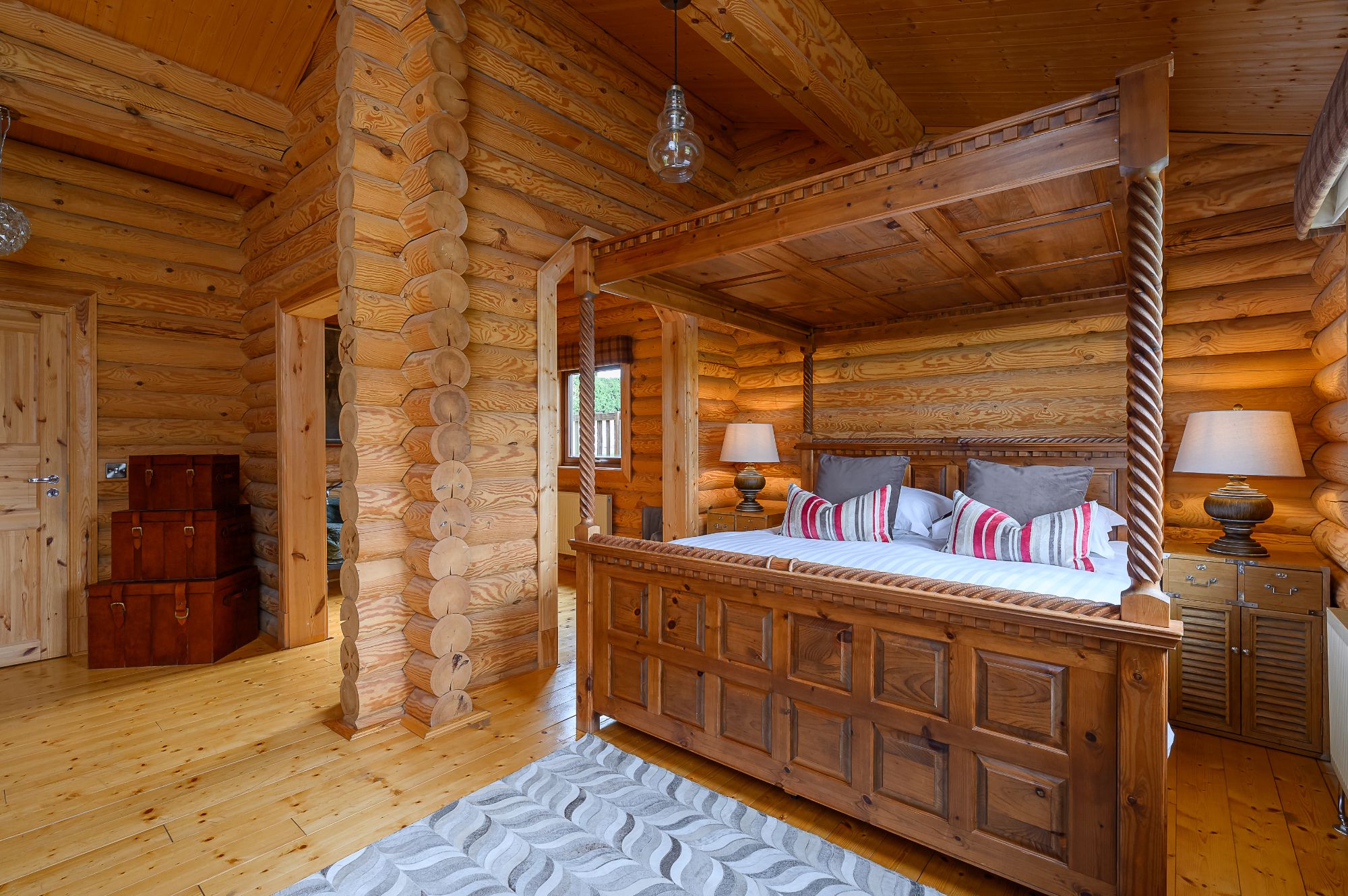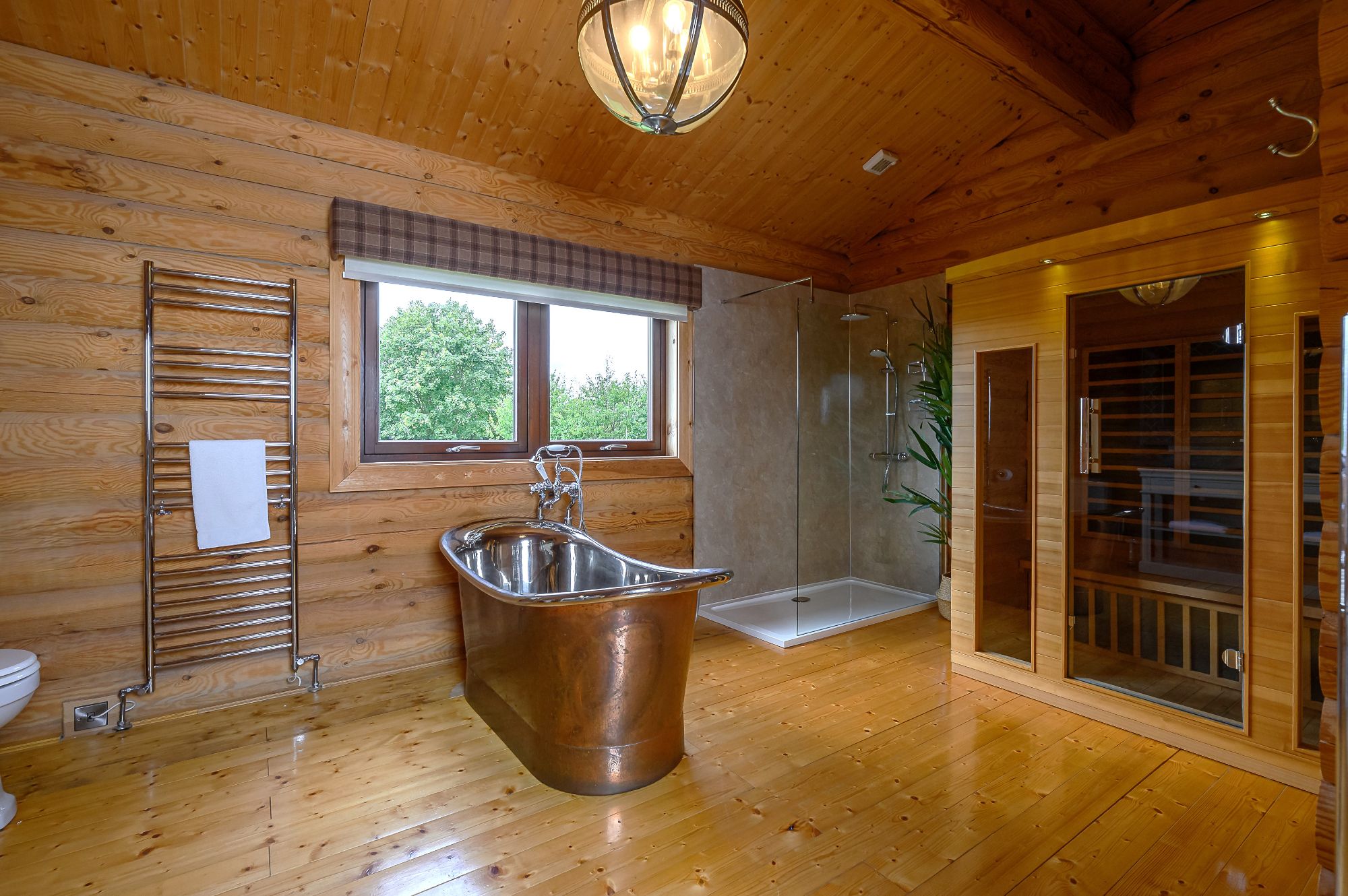 This beautiful log cabin in Yorkshire sleeps one couple plus pooches. The spacious bedroom features a four-poster fixed super king-sized bed, Smart TV stunning views from the window. French doors lead out to your private patio and the covered hot tub. The luxury en-suite boasts a stunning copper roll-top bath, separate shower and an infrared sauna for two.