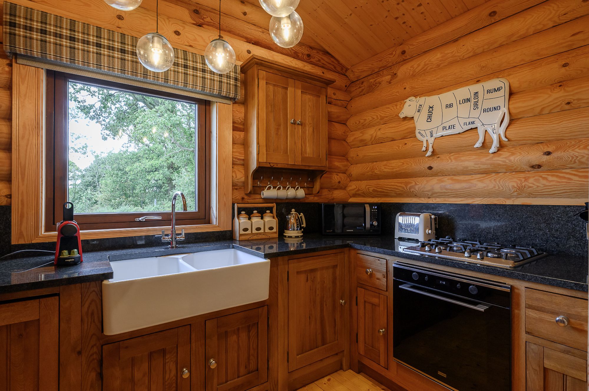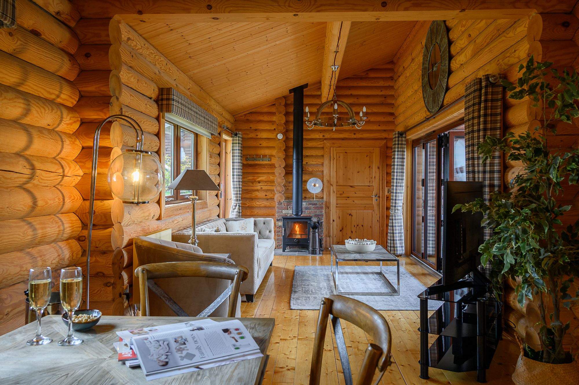 Rustic charm meets modern elegance at these Yorkshire lodges with hot tubs. Fully refurbished this year, you'll find stylish open-plan log cabin living designed with comfort and relaxation in mind. Be sure to light the log-burning stove and get the fire roaring before cosying up on the comfortable sofa with a movie on your Smart TV. The well-equipped self-catering kitchen, complete with a Nespresso coffee machine, has everything you need for a weekend in, but if you fancy a truly luxurious break you can always enhance your stay and perhaps treat yourself to a relaxing beauty treatment. Enjoy stunning indoor-outdoor living with Bifold doors off the lounge lead to a garden with private patio, BBQ, seating area, covered hot tub and, of course, those uninterrupted views of the farm and rolling hills beyond.