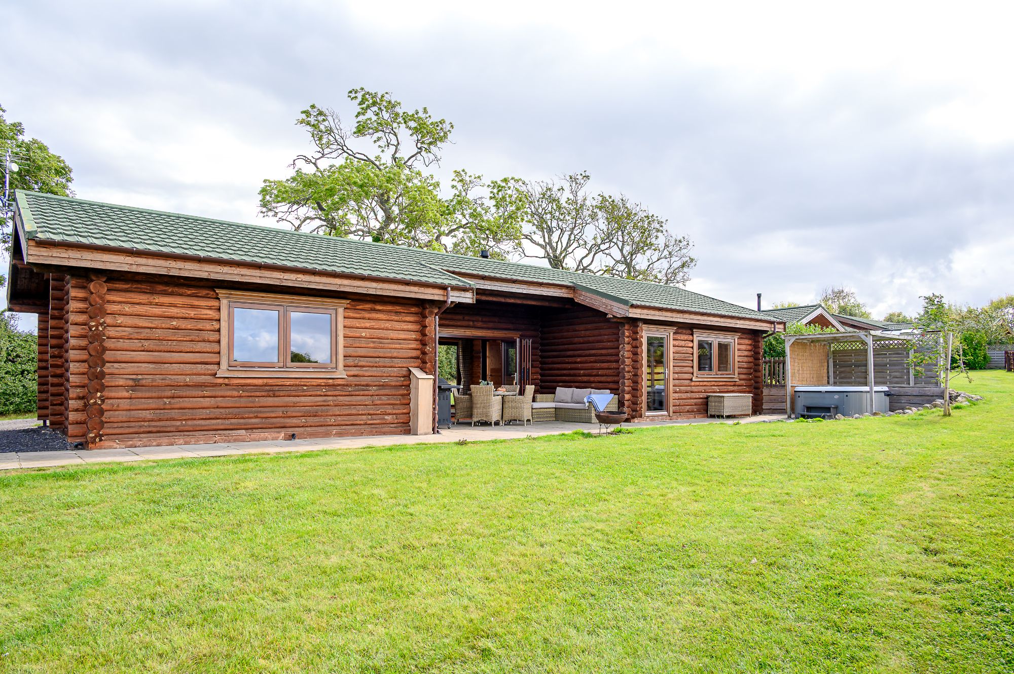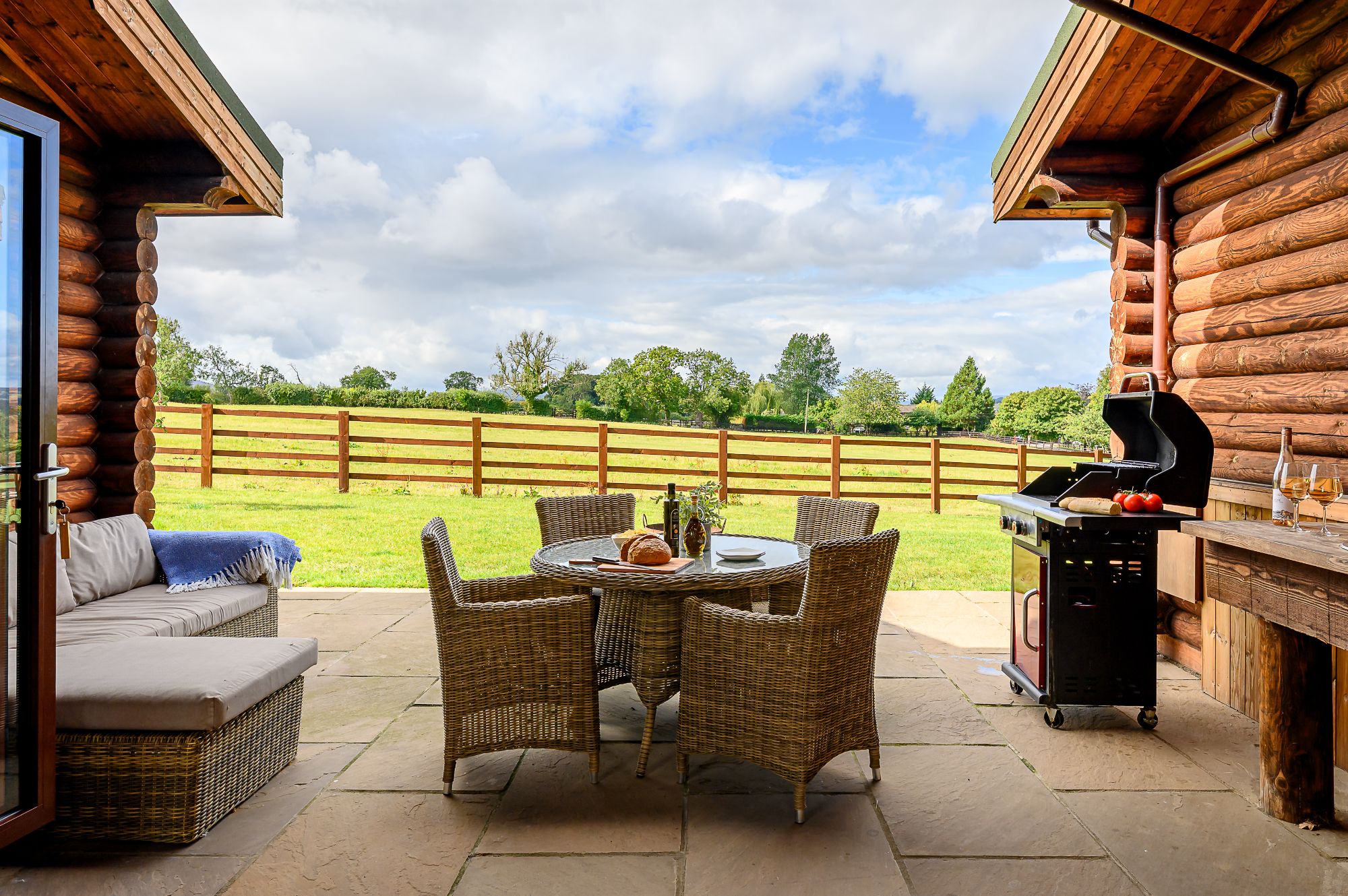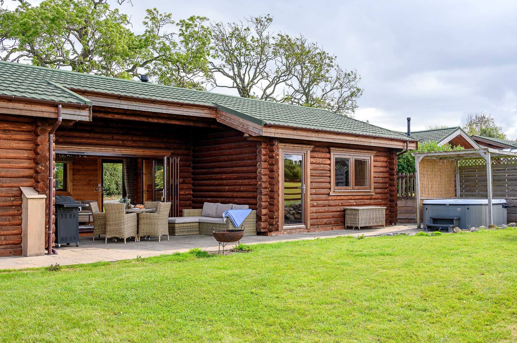 A stone-flagged patio has a gas BBQ, outdoor table and further rattan sofa seating. The covered hot tub sits to the side of the luxury log cabin, sited to best take in the sweeping Yorkshire views.