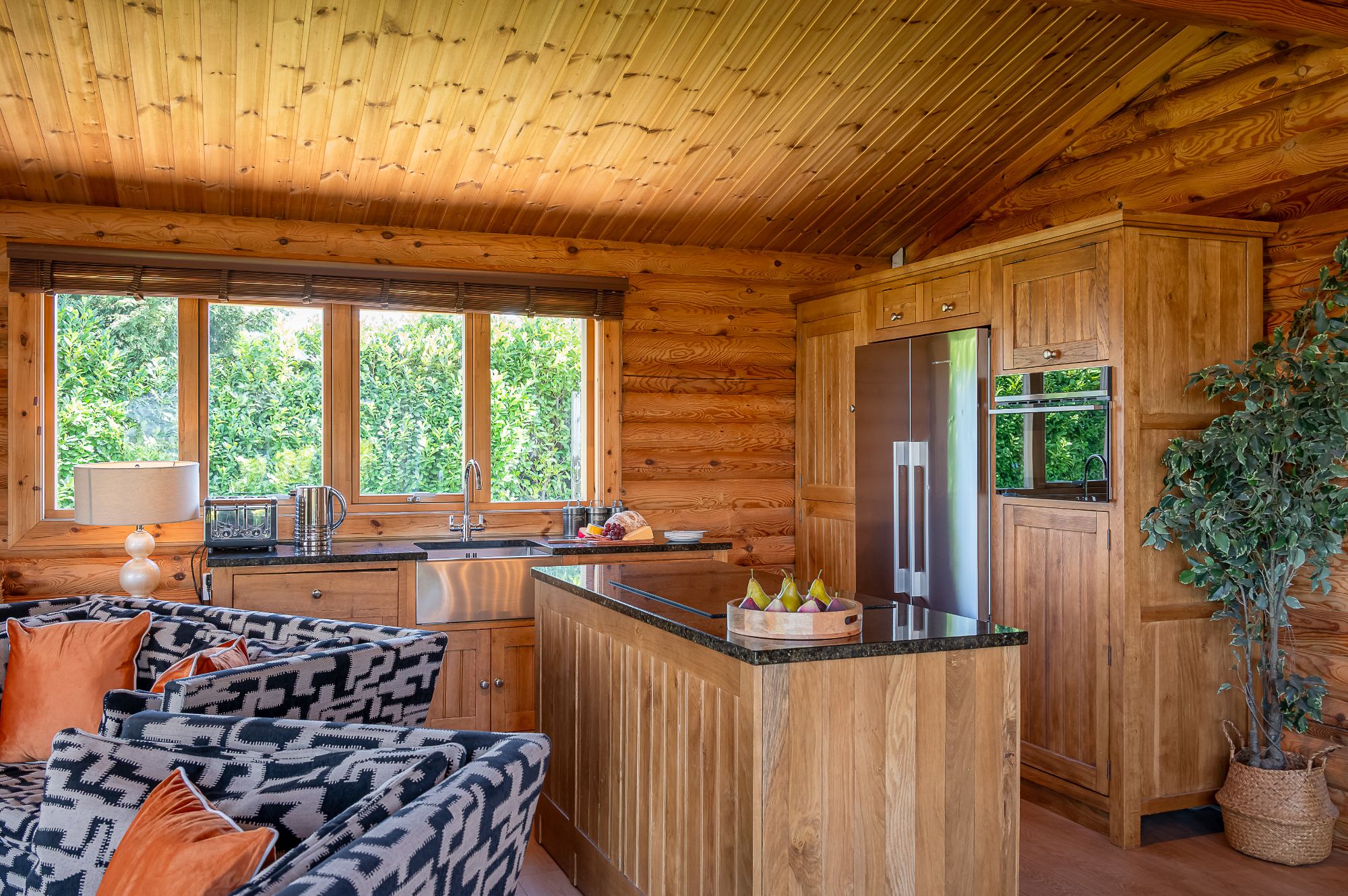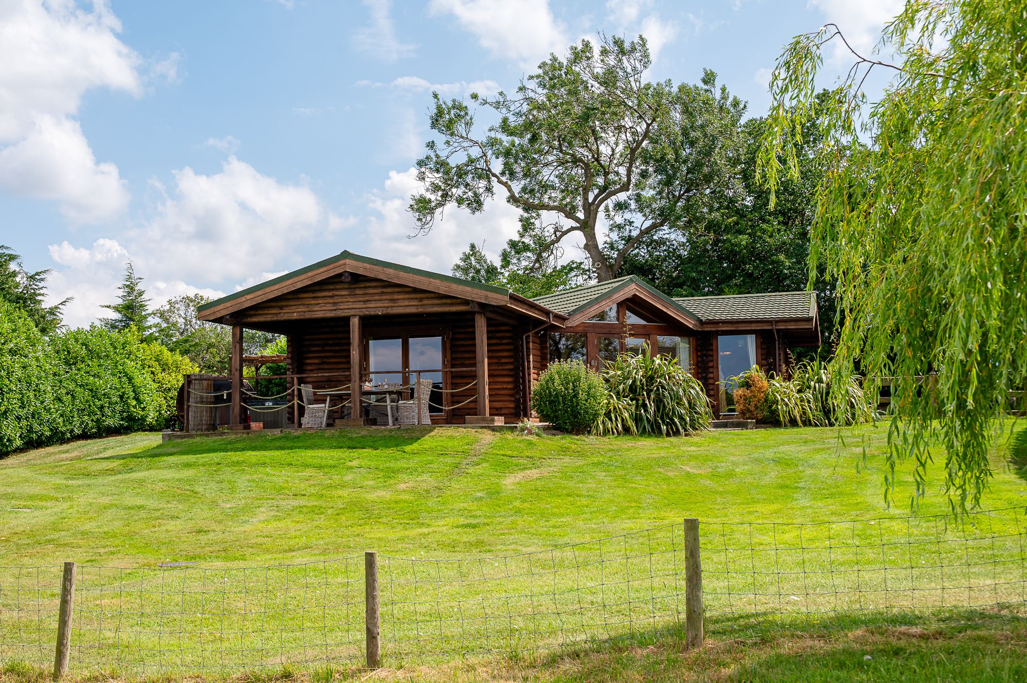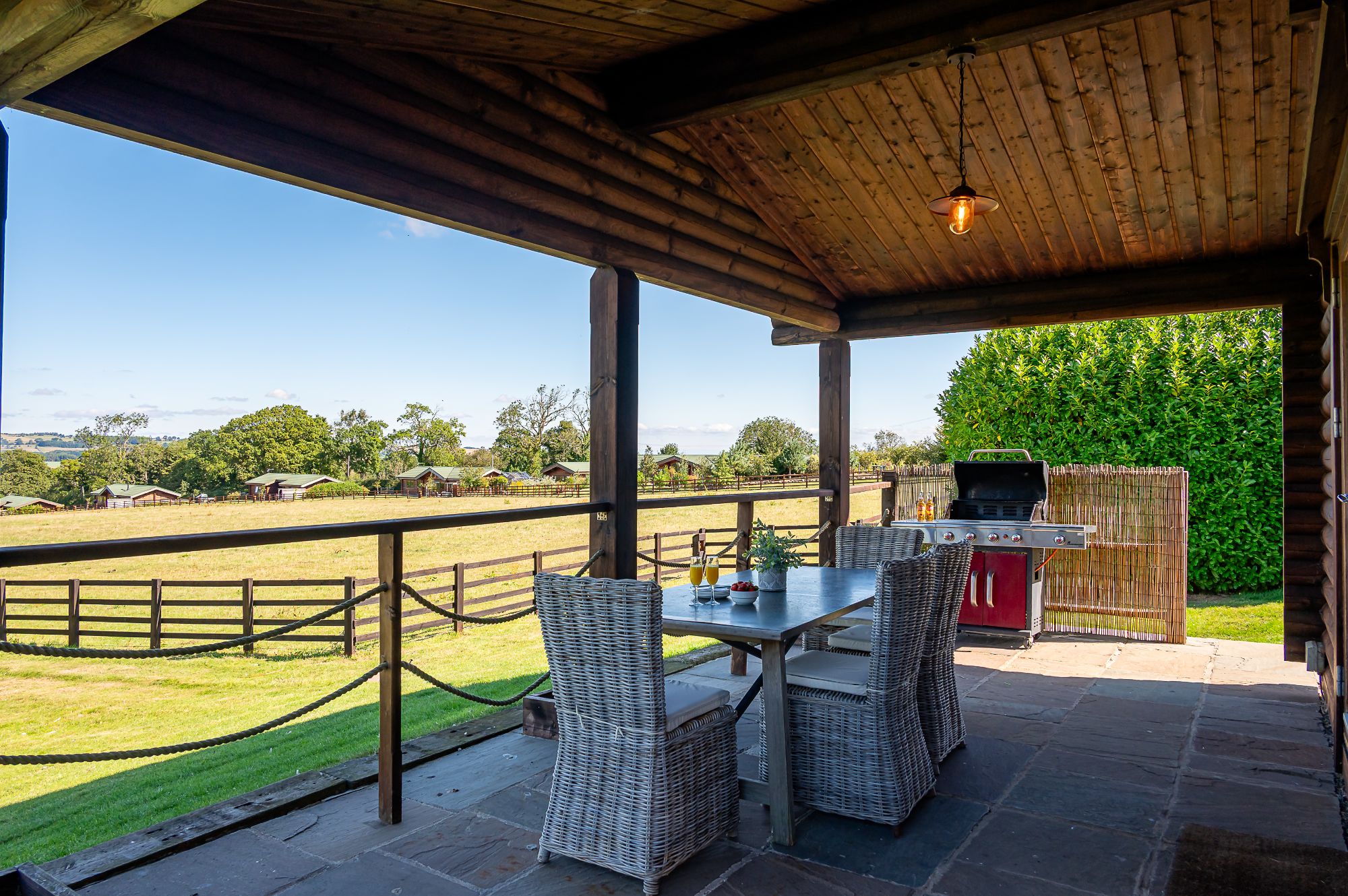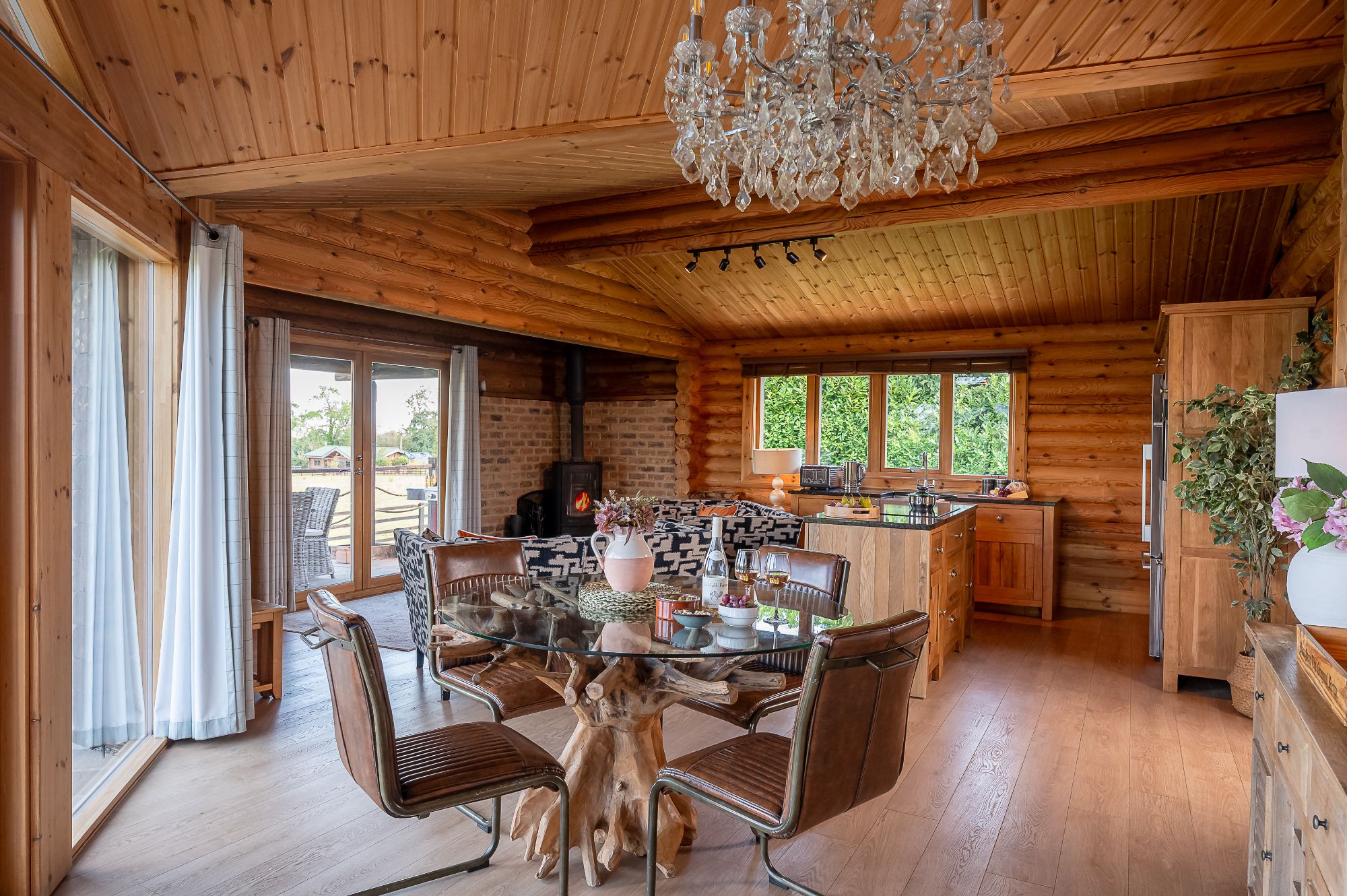 Upon arrival, be greeted with a perfect blend of rustic charm and contemporary features. Sink into the sumptuous sofa and truly relax by the crackling log burner. Pop a film on the Smart TV for a relaxed night in or simply sit back and watch the wildlife through the large glass patio doors of your luxury log cabin overlooking the peaceful landscape. Be sure to make use of the well-equipped self-catering kitchen, complete with a Nespresso coffee machine. Enjoy the freedom to cook at your own pace, whether it’s a hearty breakfast or a romantic dinner enjoyed around the sleek glass and wood table. Dine al fresco undercover on the garden patio or gather around the gas-fired BBQ for a feast with a view.